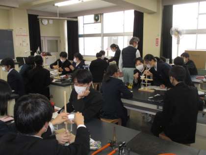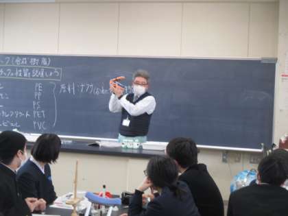 プラスチックの性質を環境問題や地震とも関連づけながら学んでいました。グループで意見を出し合ったり実験したりしながら進めていました。