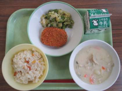 献立は、はなやかえびピラフ、牛乳、かぼちゃんコロッケ、アスパラサラダ、もりのあきまつりシチューです。はなやかえびピラフは、「14ひきぴくにっく」に登場するお花畑を、かぼちゃんコロッケは、家族みんなでかぼちゃを大切に育てる様子をイメージしました。もりのあきまつりシチューは「14ひきのあきまつり」に出てくる、きのこをたくさん使ったシチューです。