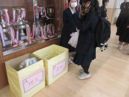 生徒玄関では2者択一でのアルミ缶回収が行われていました。今回は、将来住むなら「地元派」又は「県外派」でした。