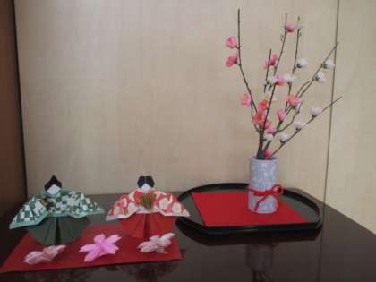 2月14日(月)ちょっと一息 公開日 2022/02/14 更新日 2022/02/14 学校生活 校舎内の数カ所に、折り紙で作られたひな人形が飾られています。写真は生徒玄関廊下のものです。職員の家族の方が作成されました。 今日は、生徒玄関で太陽の光をいっぱい浴びて暖かそうでした。