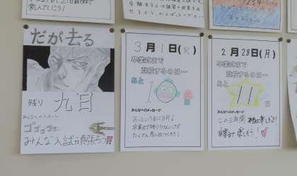 3月3日(木) 3年・卒業までのカウントダウン!! 公開日 2022/03/03 更新日 2022/03/03 3年生 各クラスに掲示してあるカウントダウンカレンダーは、今日で残り8日となりました。そのうち県立一般入試の2日間を除くと、登校日数はあと6日です。和合中学校で過ごす毎日を大切にしましょう!!