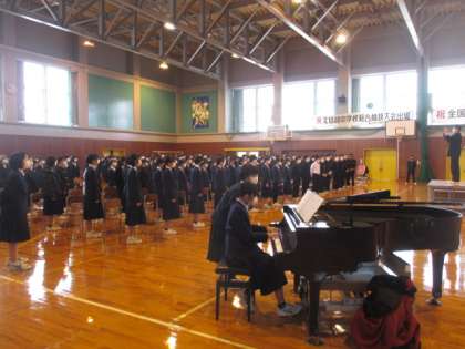 3月8日(火)合唱練習の様子 公開日 2022/03/08 更新日 2022/03/08 学校生活 1,2年生が合同で、3年生とのお別れ会に向け合唱練習を行いました。2年生の担当者が、特に意識して歌ってほしいところのポイントを具体的に説明しながら練習しました。