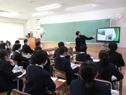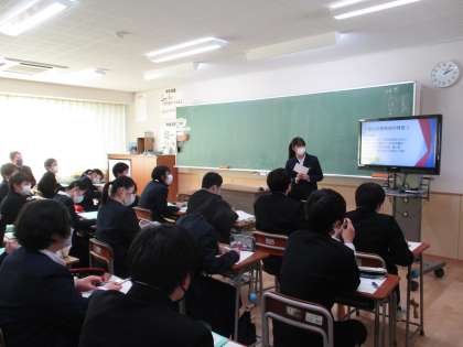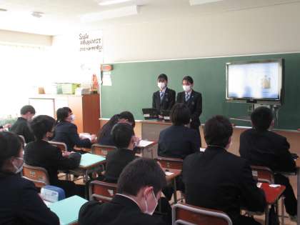 3/8(火) 2年 先輩に学ぶ高校生活1 公開日 2022/03/08 更新日 2022/03/08 2年生 本日は「先輩に学ぶ高校生活」を行いました。本校OBが4つの会場で、高校生活の様子や中学校との違いをなどをスライドを使って分かりやすく説明して頂きました。少し緊張した様子も見られましたが、真剣に高校生の話を聞いていました。