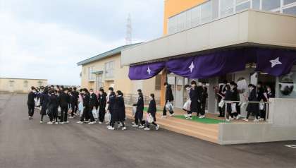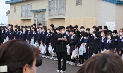 和合中学校を後にした卒業生が生徒玄関に整列し、これまで支えてくれて、愛情を注いでくださった家族へ感謝の気持ちとこれからもよろしくお願いしますと伝えました。