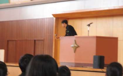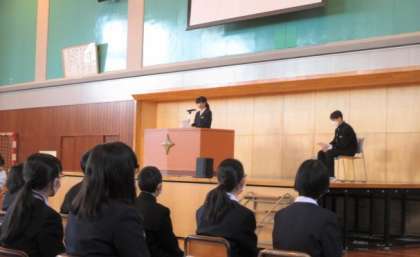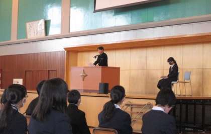 各学年の代表生徒が3学期(1年間)を振り返っての意見発表を行いました。学級代表や生徒会副会長の経験から学んだこと、学校行事等での3年生の姿から学んだことを堂々と発表していました。