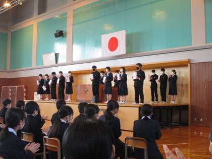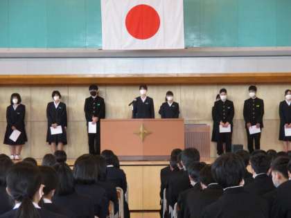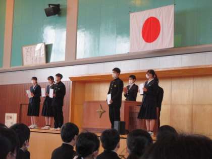 4月6日(水)生徒会認証式 公開日 2022/04/06 更新日 2022/04/06 学校生活 始業式後、生徒会認証式がありました。新しく役員や委員長になった生徒に、校長先生と生徒会長から認証書、委嘱状が渡されました。