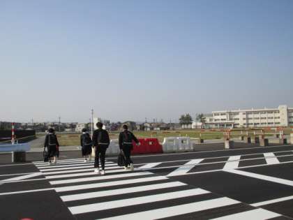 昨年度途中から、中学校北側に開通した広い道を渡っている箇所です。信号機がないので、自動車が停止したのを確認して素早く渡りましょう。