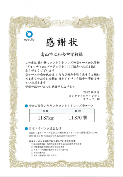昨年度の生徒会執行部で回収、郵送した空コンタクトレンズケースについて、感謝状が届きました。