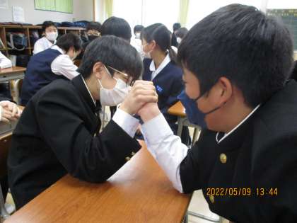 GWあけ。1年生は昼休みも元気いっぱいです。新しいクラスにも大分慣れ、ワイワイと楽し気に過ごしています。腕相撲がはやっているクラスもあるようですね。