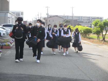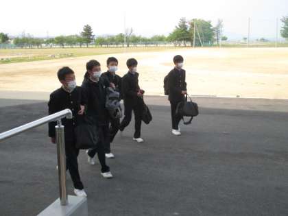 5月11日(水)登校時の様子 公開日 2022/05/11 更新日 2022/05/11 学校生活 5月中旬になり、学校周辺の水田はほぼ田植えが終わったようです。と同時に修学旅行の時期、明日から3年生は3年ぶりに関西へ出かけます。今日はその荷物も持って登校してきました。楽しみですね。