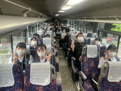 課題別班別学習、スタートです。このバスはカップヌードルミュージアムに向かいます。みんな元気です!