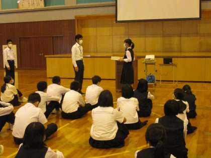 5月30日(月)2年 14歳の挑戦 結団式 公開日 2022/05/30 更新日 2022/05/30 14歳の挑戦 明日から始まる14歳の挑戦の結団式を行いました。 実行委員を中心に、活動をする上での注意点や心構えをクイズ形式で発表しました。 式の最後には学年代表が音頭をとり、学年全員で声と心を合わせました。