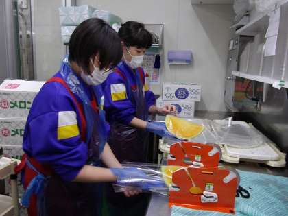 スイカの包装をしています。