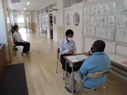 6月2日(木) 3年授業の様子 公開日 2022/06/02 更新日 2022/06/02 学校生活 3年生は英語の授業で、ALTの先生を相手にスピーキングテストを行いました。先日の修学旅行での思い出をトピックに、習った表現を駆使してコミュニケーションを図りました。先生に行った場所を勧めたり、会話を膨らませるために質問を入れたりと、工夫を入れている生徒も多く見受けられました。