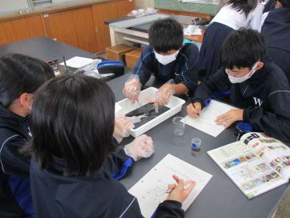 6月8日(水) 1学年授業の様子(1) 公開日 2022/06/08 更新日 2022/06/08 1年生 理科ではイカの解剖を行いました。初めて使う器具に戸惑っていましたが、グループで協力し、解剖ミッションに一生懸命取り組んでいました。