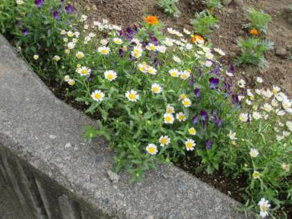 下の写真は正面玄関の花壇です。雨蛙が元気に跳びはねていました。どこにいるか分かりますか?