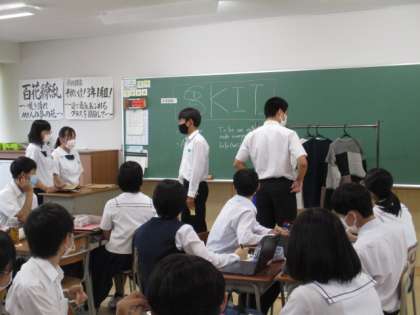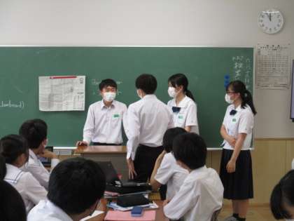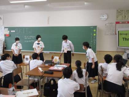 6月16日(木) 3年授業の様子 公開日 2022/06/17 更新日 2022/06/17 学校生活 英語の授業では、グループごとのスキット(1分程度の寸劇)発表会を行いました。設定から会話の内容、役割、工夫点等を自分たちで準備して、グループごとに特色が出ていました。"Make everyone fun"(観衆を楽しませる)というテーマのもと、大いに盛り上がった時間となりました。内容理解力と表現力の両面で成長を実感している生徒も、きっと多いのではないかと思います。