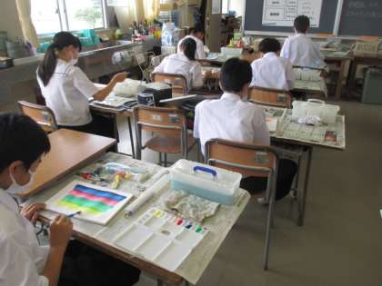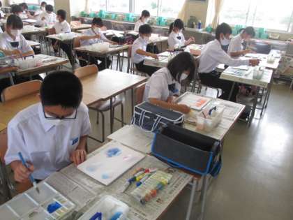 1組美術 「私の心の空を表現しよう」。自分のイメージを表現しようと筆を動かしていました。
