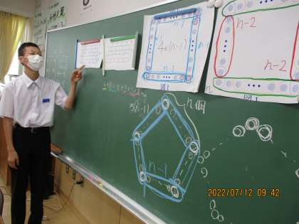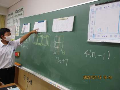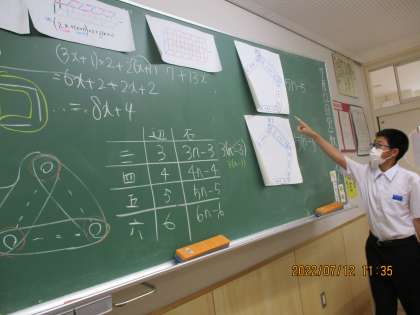 「第2章 文字と式」の発展課題に取り組み、発表しているところです。小学校算数でも学習した、正方形を横にx個並べるときの棒の数の求め方を、立体や他の図形に発展させた問題です。