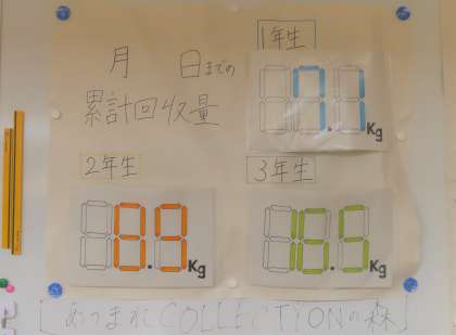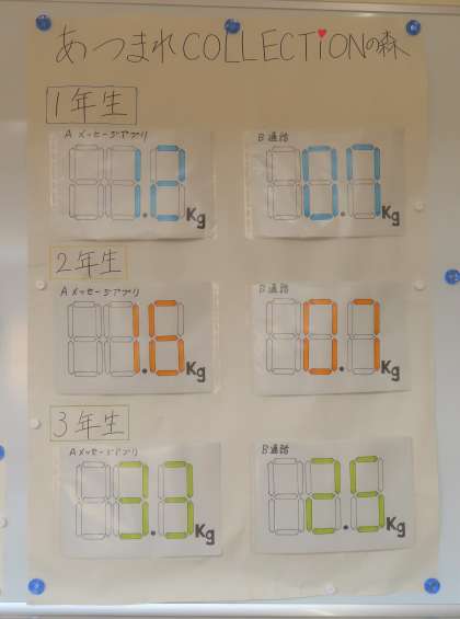 生徒玄関前には、「あつまれCOLLECTiONの森」の回収量が掲示してあります。前期生徒会執行部の掲げている目標まで、着実に進んでいます。