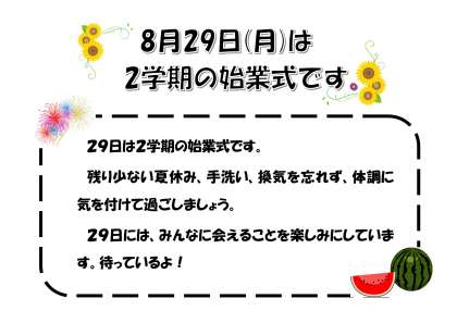 8月25日(木)もうすぐ始業式です。 公開日 2022/08/25 更新日 2022/08/25 学校生活 29日にみなさんが登校するのを心待ちにしています。 もし、心配や不安があれば遠慮なく相談してください。また、学校以外にも相談できるところがたくさんあります。 残り少なくなった夏休みですが、始業式に参加する生徒の姿を楽しみに、準備を進めています。
