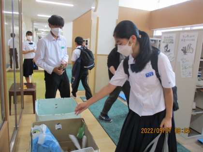 本校生徒会の収集活動は、ひと味違っていて、毎回お題があります。今回は「あなたは理系?文系?」でした。どちらに入れるか迷っている姿も見られました。