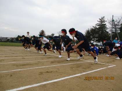 9月27日(火) 1学年運動会予行練習の様子 公開日 2022/09/28 更新日 2022/09/28 1年生 短距離走は、みんないいスタートダッシュでした。 学年競技の「みんなでハリケーン!」は、前回の練習とは結果が大分入れ替わりました。