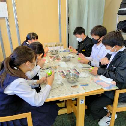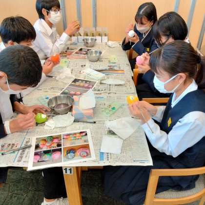 観光物産館起上り手描き体験で、一人一人自由に描いています。