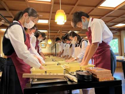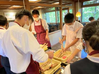 森八で落雁作り体験を行いました。 体験の最後には、作った落雁をお抹茶と一緒にいただきました。