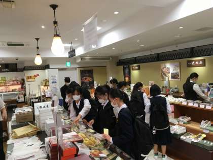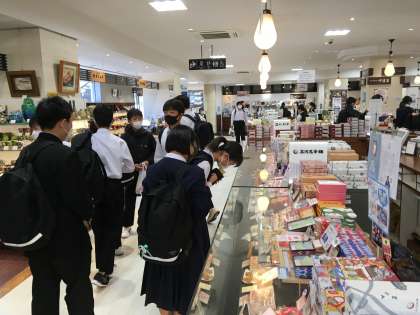 体験後、観光物産館で家族へのお土産を選んでいます。