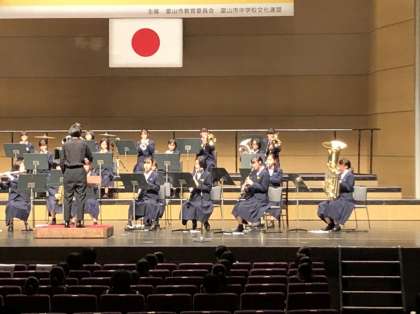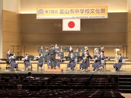 3年ぶりにオーバード・ホールにおいて富山市中学校文化祭が開催されました。本校からはステージ発表で吹奏楽部が、科学展覧会優秀作品として1名、作品展示として、書道1名、美術4名が参加しました。
