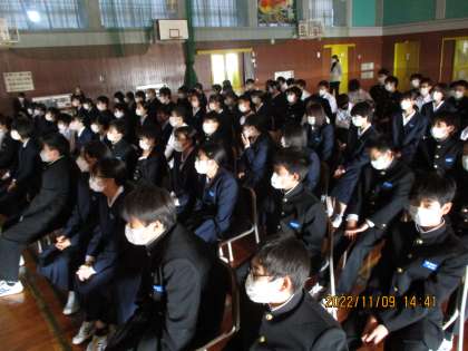 11月9日(水) 1学年 産婦人科医の講話 公開日 2022/11/09 更新日 2022/11/09 1年生 思春期まっただ中の子どもたちに、心のことや体のことで悩むのは当たり前、身近な大人に相談してほしい、と温かく語りかけてくださいました。 反面、SNSの危険性についても言及し、「判断力、自制力、責任力」をもつことの大切さを再認識したことと思います。