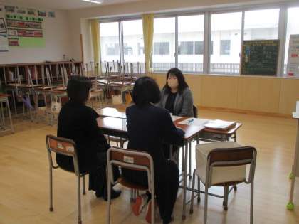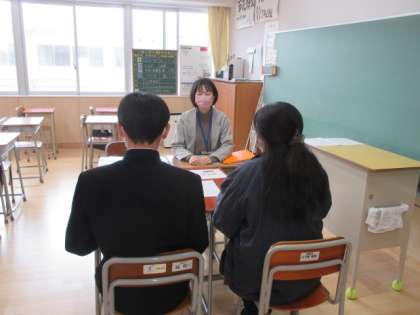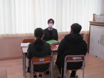 12月19日(月)放課後の様子 1 公開日 2022/12/19 更新日 2022/12/19 学校生活 2学期保護者懇談会の2日目。積雪のある中、各教室では、保護者、生徒、担任の3人で行われました。時々、生徒と保護者の方が顔を見合わせる場面もあり、温かい雰囲気で行われていました。