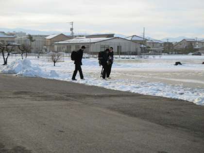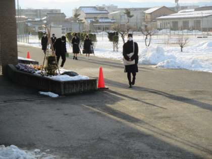 今日は、日差しのある冷たい空気の中を登校してきました。人影はとても長く、明日は冬至ですね。グラウンドには薄ら氷が張り、足の裏で感触楽しむ生徒もいました。