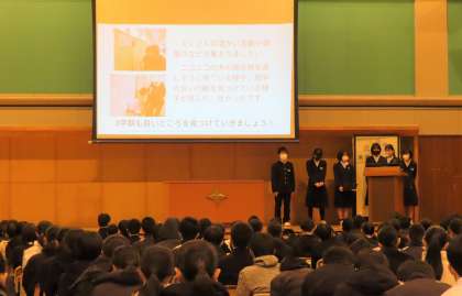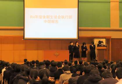 後期生徒会執行部のメンバーから、活動の中間報告がありました。3学期も引き続き、生徒会活動に協力していきましょう。