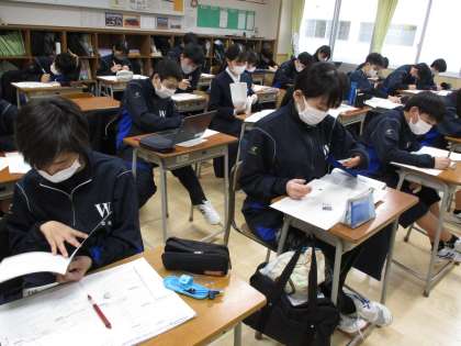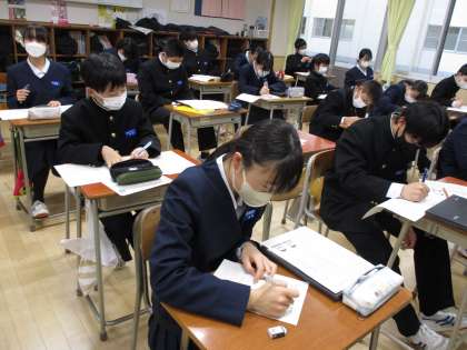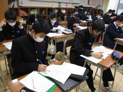 学年末考査に向けて学習計画を立てました。週末課題で考えてきた「ゴールから逆算し、具体的な実現プランをたてる」をもとに、「苦手教科に毎日10分以上取り組む」や、「スマホを親に預ける」など、色々なアイディアが出ていました。