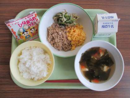 メニューは、そぼろ丼、牛乳、なばなひたし、すまし汁、ひなあられ でした。