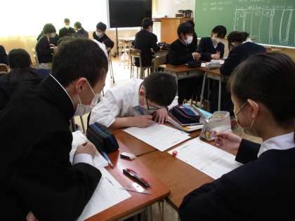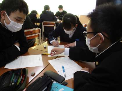 数学は、多数回の試行によって得られる確率の意味について、実験をしながら考えました。グループで協力して、手際よく処理していました。
