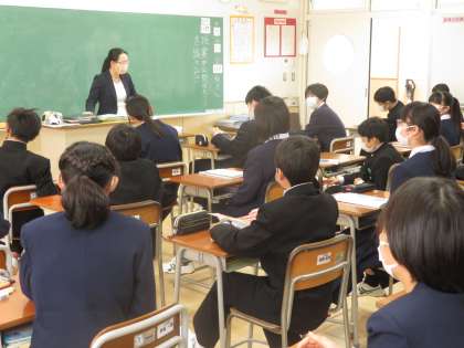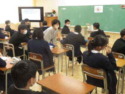 (写真中)英語「お隣の人とあいさつをしましょう」