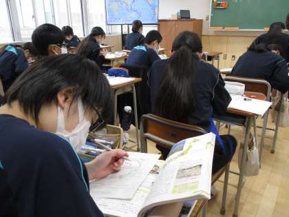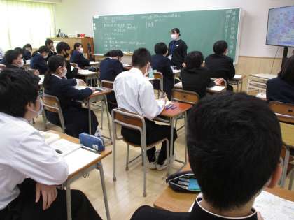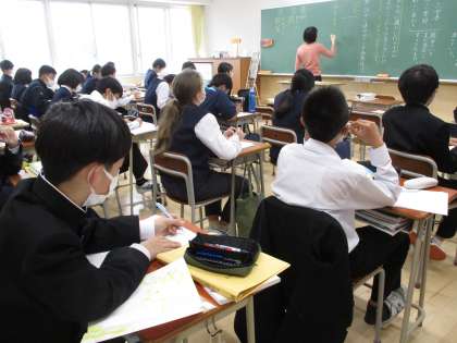 4月14日(金)2年生「授業の様子」 公開日 2023/04/14 更新日 2023/05/11 2年生 教科の授業が始まって2日目。 地理は日本の地形を学習しています。授業の最後は問題演習でしたが、一人一人が教科書や資料集を調べながら、真剣に取り組んでいました。 歴史は江戸時代を学習しています。スライドの資料を見ながら、江戸幕府の仕組みについて学びました。 週末は、中教研学力調査の直し(見直し)とこの2日間の授業の復習に取り組みましょう。