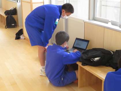 4月26日(水)3年生「放課後の廊下のベンチで」 公開日 2023/04/26 更新日 2023/05/11 3年生 男子生徒が集まってクロムブックを開いていました。 修学旅行のコースを検討しているのだそうです。 なるほど。便利な時代になりました。