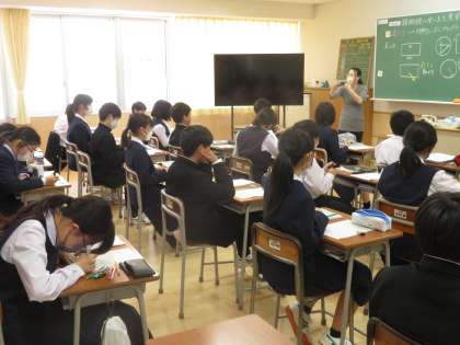5月1日(月)1年生「授業風景」 公開日 2023/05/01 更新日 2023/05/11 1年生 4限目の3組は理科。 顕微鏡の使い方について勉強しています。 「最初は低倍率のレンズから使います。どうしてですか?」