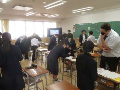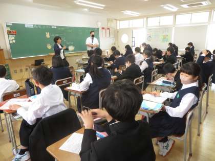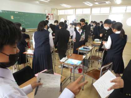 5月9日(火)1年生「授業の様子」その2 公開日 2023/05/09 更新日 2023/05/11 1年生 3組はALTの先生と英語の授業。 「Can You 〜 ?」とお互いに、できるかどうか尋ねています。