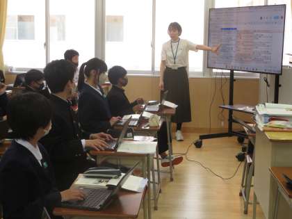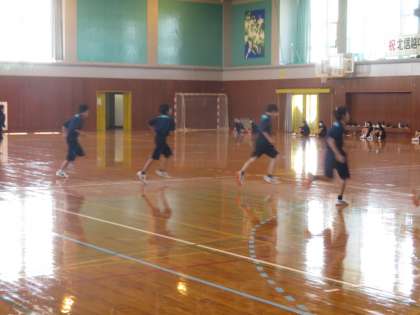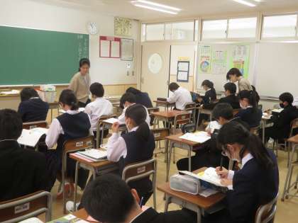 5月10日(木)1年生「授業の様子」 公開日 2023/05/10 更新日 2023/05/11 1年生 3時間目の様子です。 (写真上)1組国語「シンシュンの各場面を簡単に説明しよう」 生徒が手元の端末に入力したものが一覧になって、大きなモニターに写し出されています。 (写真中)2組保健体育「シャトルラン」 「ドレミファソラシド〜」の音階が流れる中、間に合うように頑張って走ります。 (写真下)3組英語 スクールサポーターも加わって、生徒の学習の支援をしています。
