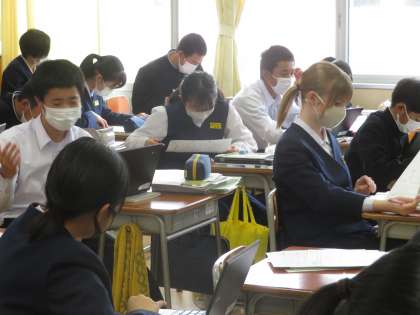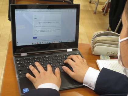 5月12日(金)3年生「授業の様子」その2 公開日 2023/05/12 更新日 2023/05/12 3年生 こちらは2組の国語です。 「『握手』はどんな話だったか、振り返りをしたり問いを解いたりして確認しよう」 それぞれの生徒が、端末に自分の言葉でまとめています。(Googleフォーム)