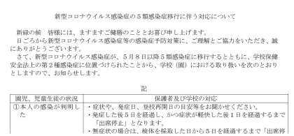 5月8日(月)からの新型コロナウイルス感染症の取扱いの変更に伴い、学校での出欠等の取扱いが変更となりました。