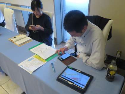 課題別班別学習で様々な場所に向かっている生徒たちの位置確認、問い合わせ、指示などで、本部は大忙しです。