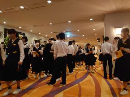 5月19日(金)3年生「修学旅行3日目」その1 公開日 2023/05/19 更新日 2023/05/19 3年生 おはようございます。 いよいよ修学旅行も最終日です。 神戸は雨。 当初予定していた震災メモリアルパークでの記念撮影は中止します。 「人と防災未来センター」から各クラス別の活動に入ります。 生徒たちが続々と朝食会場前に集まってきました。