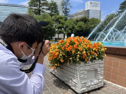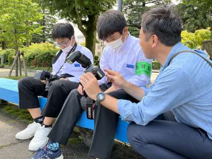 (写真上中)北日本新聞・・・記事内容にインパクトを与える写真の撮り方について指導を受けています。県庁前公園で、「初夏」をテーマにパチリ。