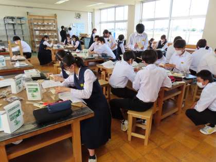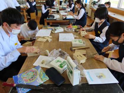 6月5日(月)3年生「授業のようす」その2 公開日 2023/06/05 更新日 2023/06/05 3年生 1時間目の2組は技術の時間。 オルゴールの木工をしています。 くぎを打つ生徒、面取りをしている生徒、ドリルで穴を開けている生徒・・・ どんな風に完成するか楽しみです。